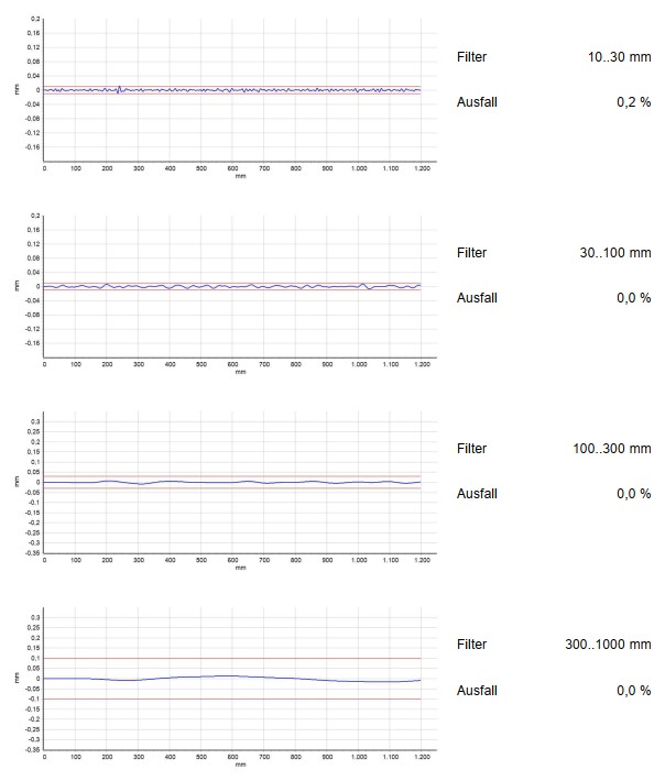 Nach der EN 13231-3:2020 sind Amplituden je Wellenlängenbereich vorgegeben. Durch die Kombination unserer Arbeitsaggregate wird diese Vorgabe gehalten.